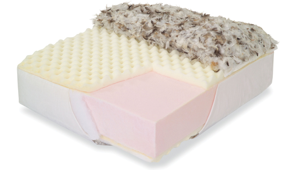 A super-soft convoluted polyurethane foam is layered on the top and bottom of a high-resiliency polyurethane core.  This “egg crate” shaped foam provides a luxurious and durable “crown” to the cushion.  A 2 oz. Dacron fiber is applied to the front edge of the core for added luxury.  A down-proof jacket encases a generous amount of blend down.  This is a supportive cushion with a bit more softness, crown and luxury to the surface. This cushion meets California TB#117-2013 and is poured environmentally safe.