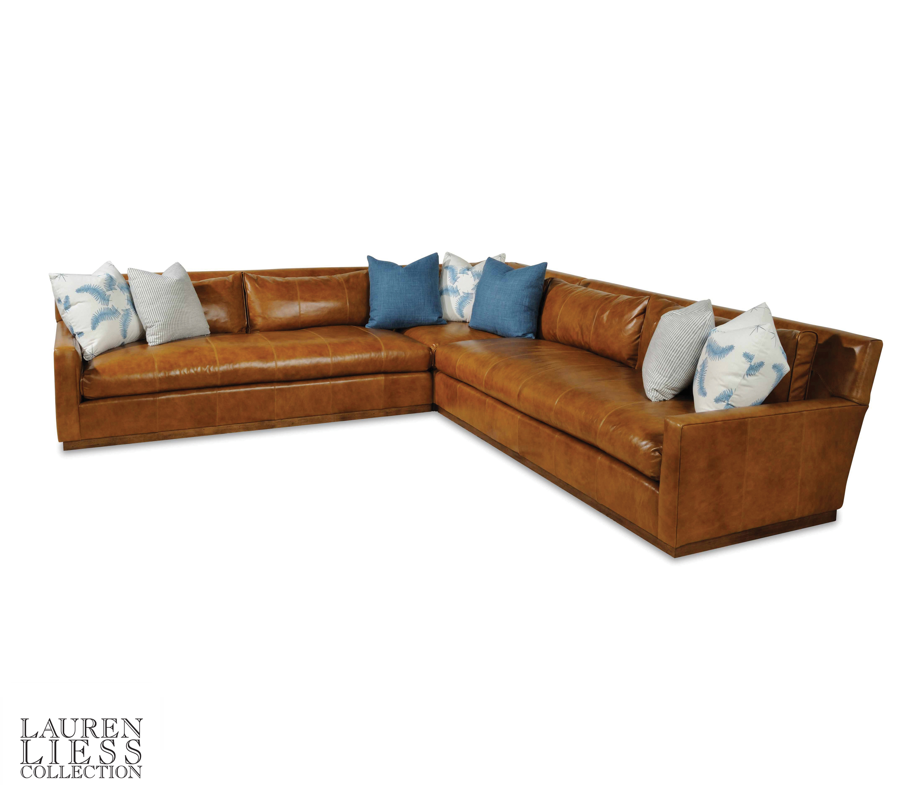 No pillows standard on leather sectional / Bullnose Bench seat cushion/ Bullnose Velcro attached back cushions with flange / Plinth base/10/90 Down Back cushion/No nails standard
