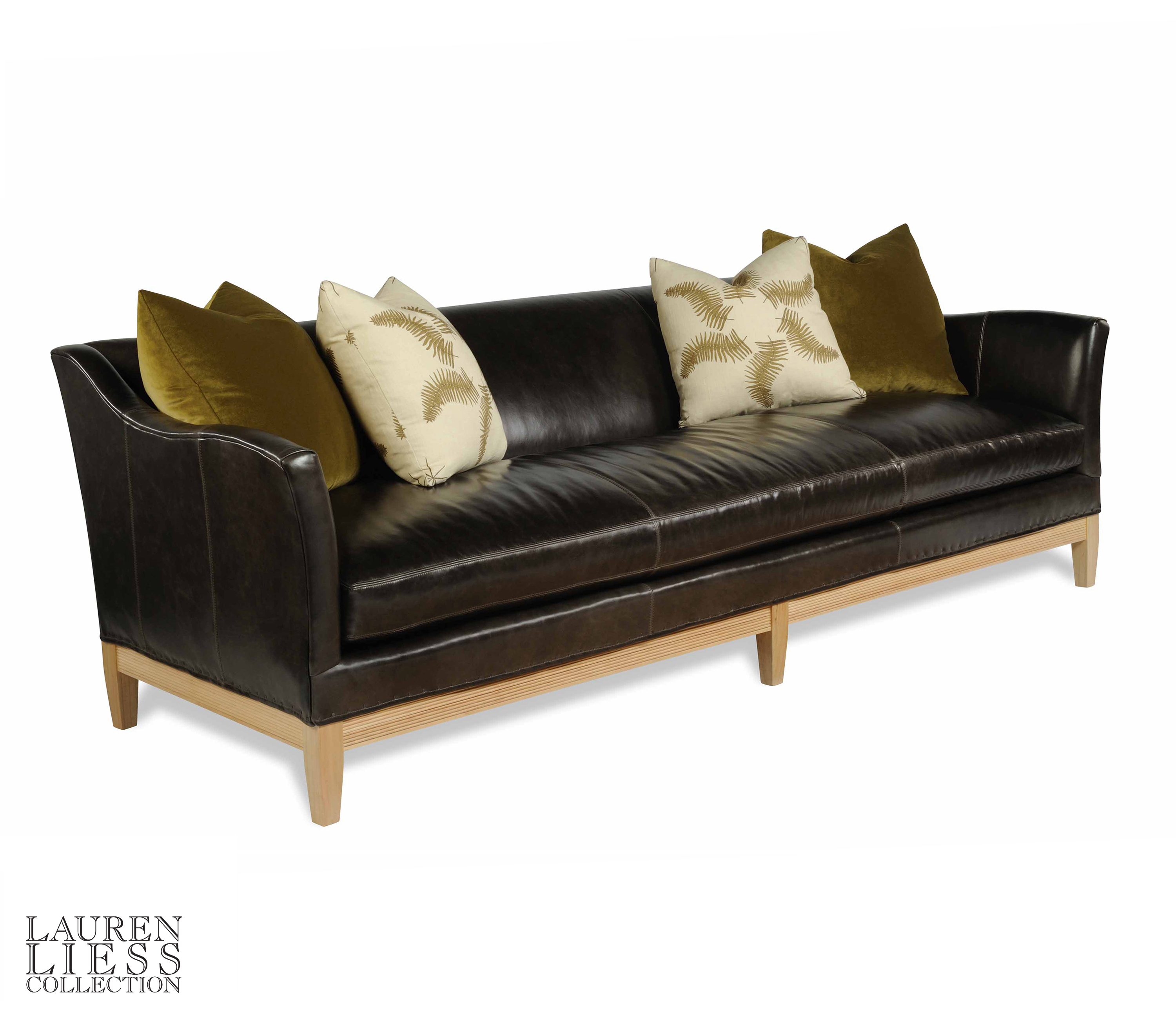 Tight back/(2)19"Throw Pillows/(2)21"Throw Pillows/Carpenter Tacks /Baseball stitching /Exposed wood base and legs.