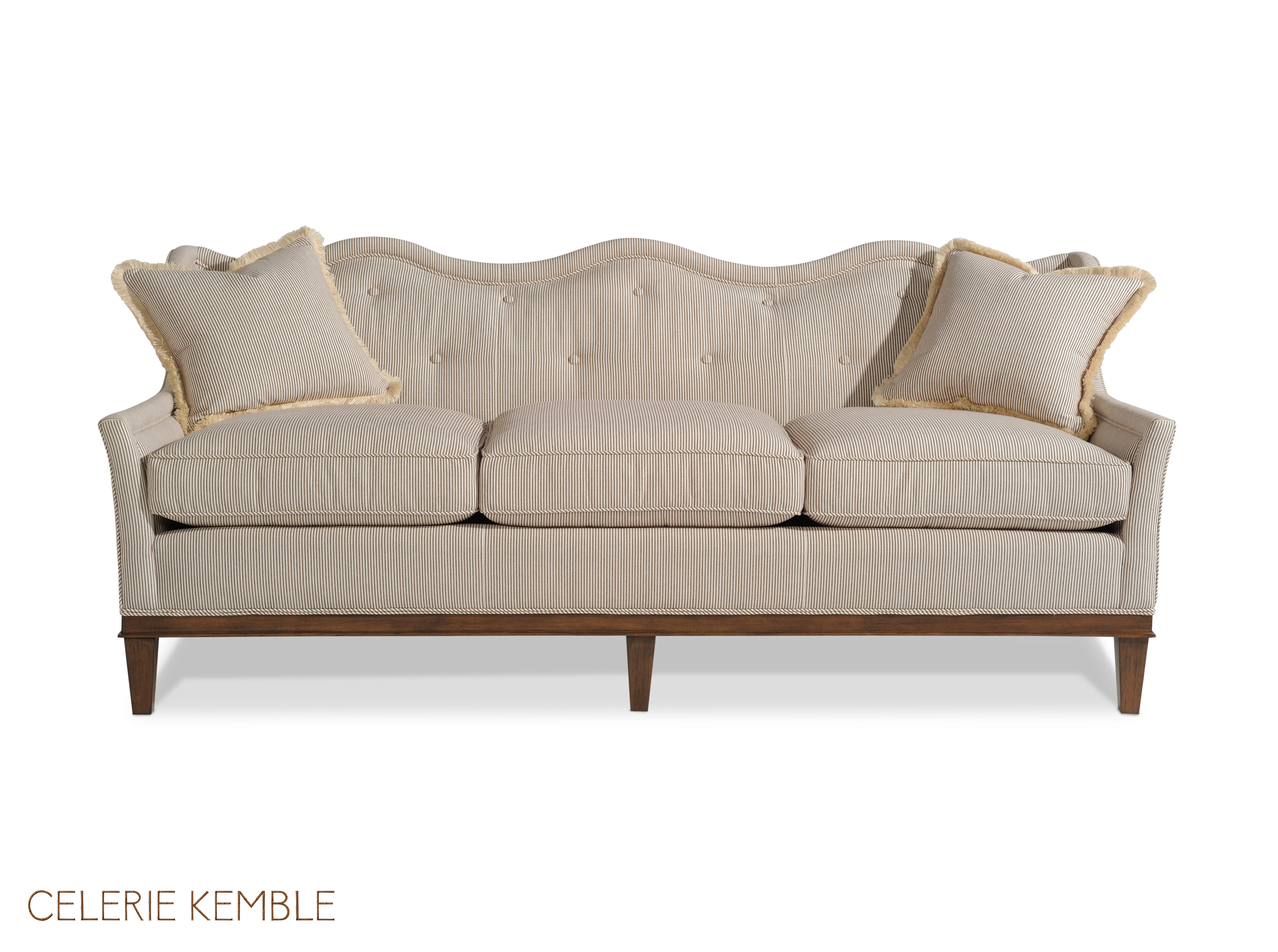 Tight back with buttons / (2)17" Throw Pillows /Buttons on in back / Wooden base and legs /
